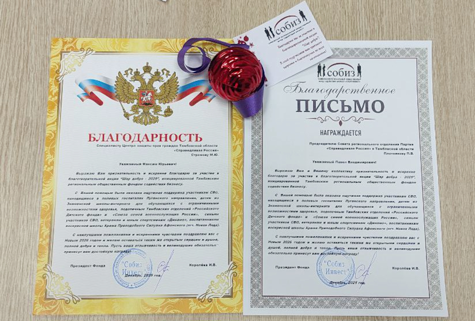 Так, фонд выразил признательность региональному отделению партии СПРАВЕДЛИВАЯ РОССИЯ в Тамбовской области за активное участие в масштабной благотворительной акции "Шар добра – 2025".