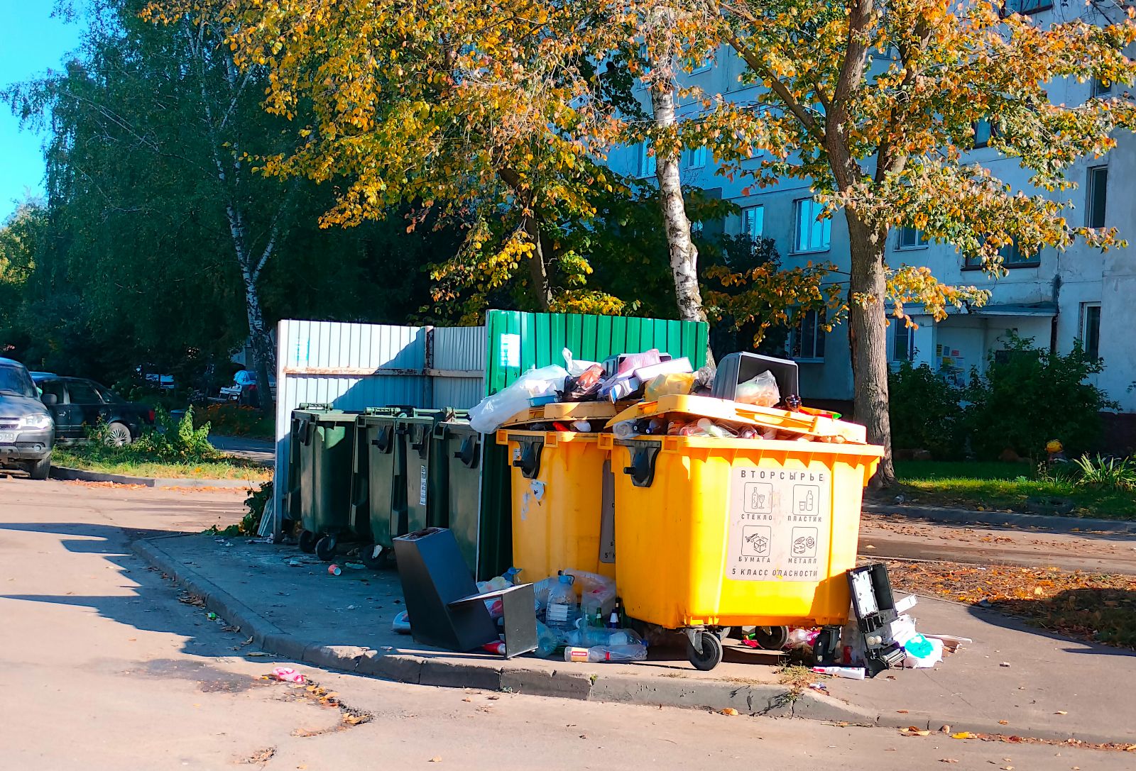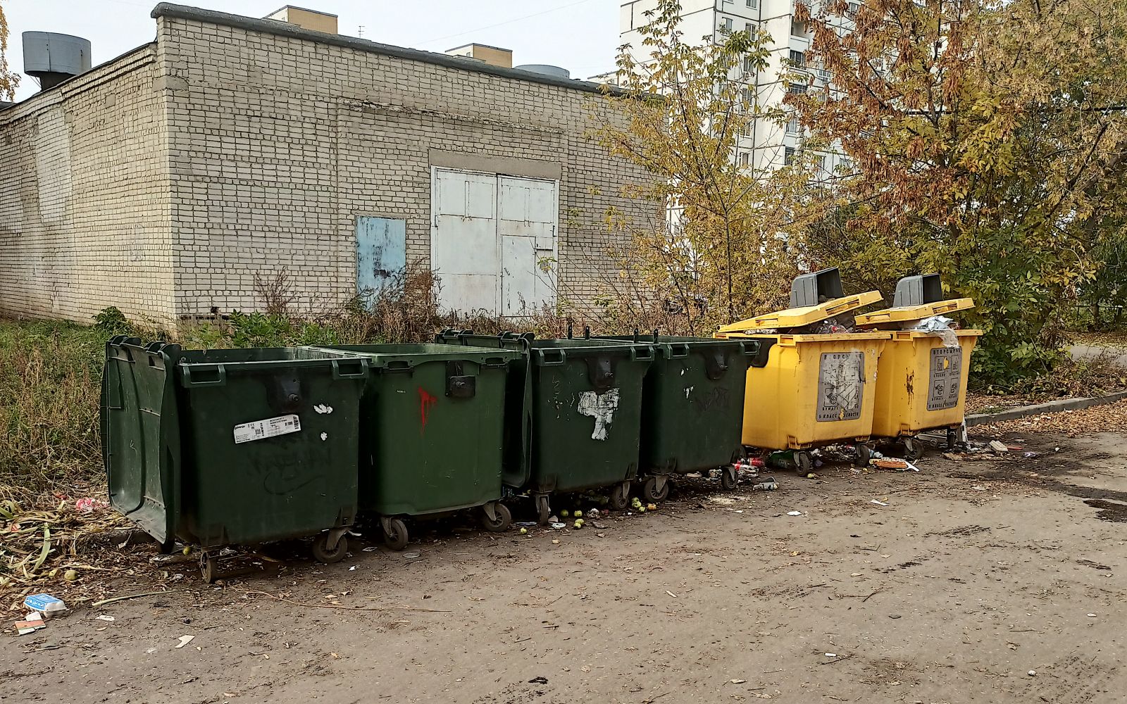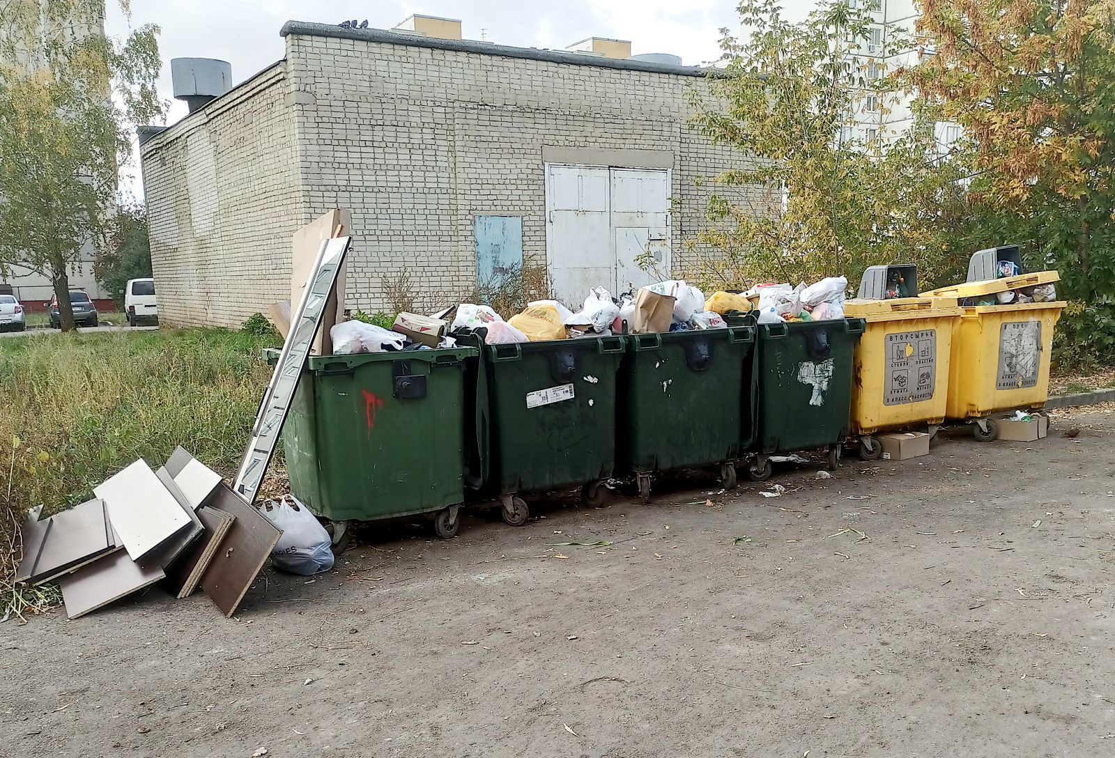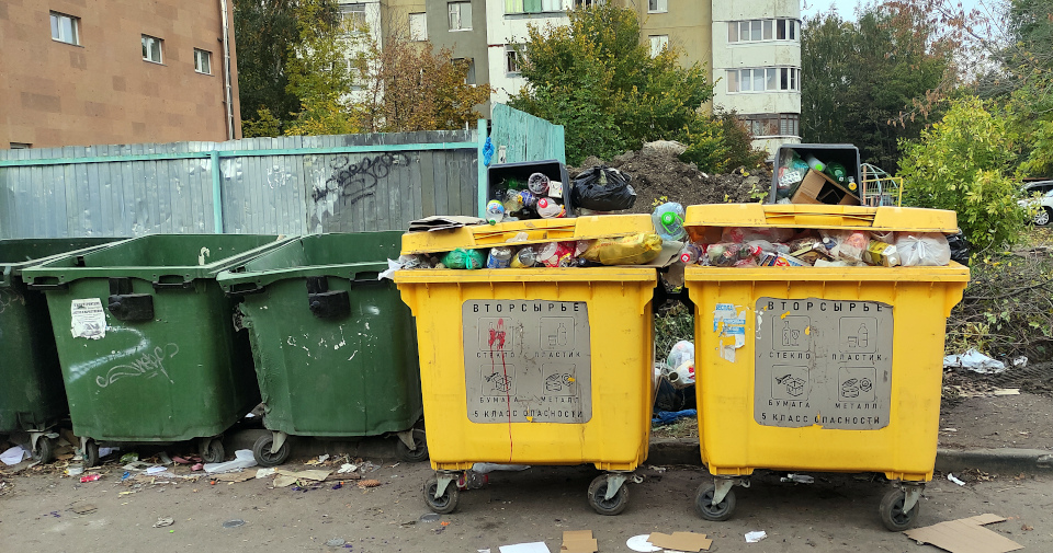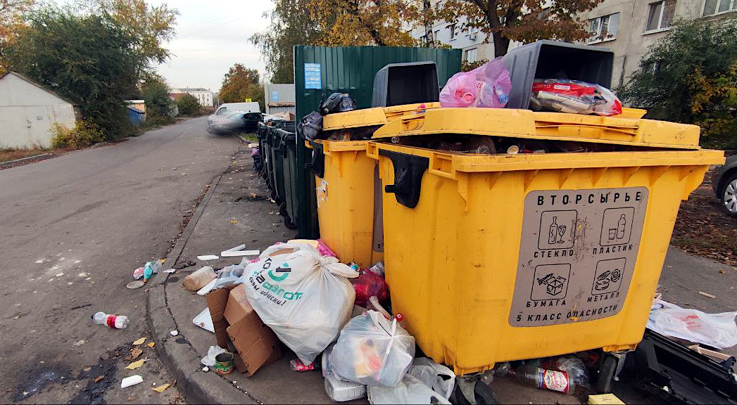 Фото по тому же адресу от 9 октября. Желтый контейнер для раздельного сбора мусора так и остался переполненным.