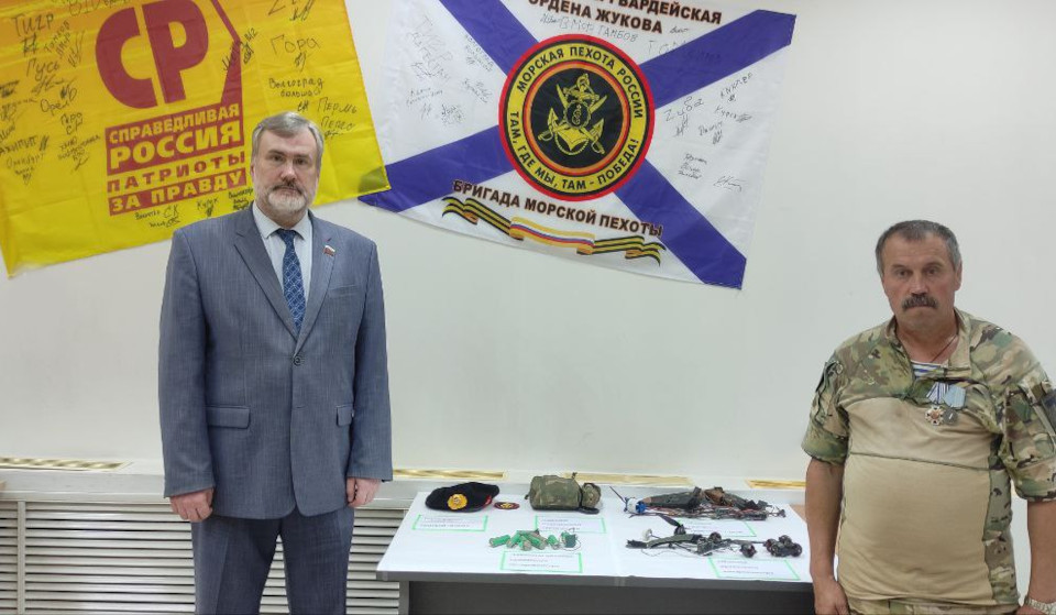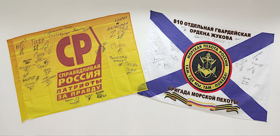 Особую ценность представляют переданные в дар от военнослужащих 810-й отдельной гвардейской бригады морской пехоты, которую партия поддерживает гуманитарной помощью, флаги с подписями бойцов, шеврон и берет военнослужащего морской пехоты.