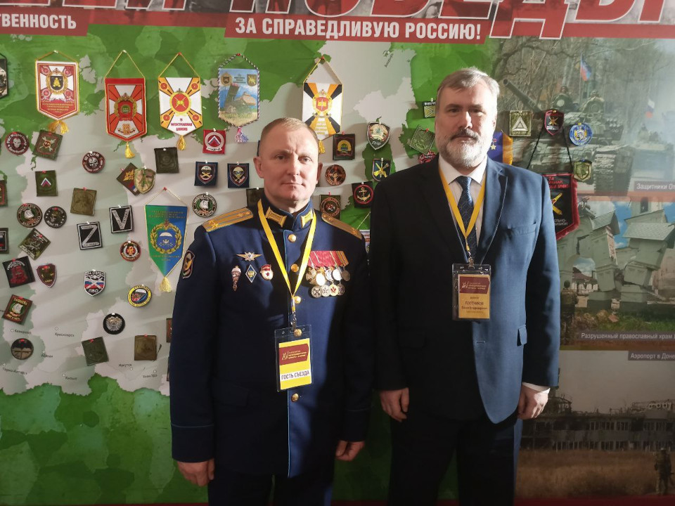 На фото: Гость Съезда, член партии, участник СВО, заместитель командира 387-го мотострелкового полка, гвардии подполковник Александр Ширин и председатель Совета регионального отделения партии в Тамбовской области Павел Плотников.