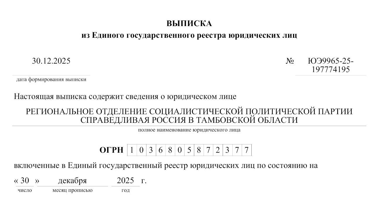 А затем настал черед внесения в Единый государственный реестр юридических лиц соответствующих изменений, касающихся региональных отделений партии. 30 декабря 2025 г. такие изменения были внесены о региональном отделении партии в Тамбовской области. Теперь его полное наименование: